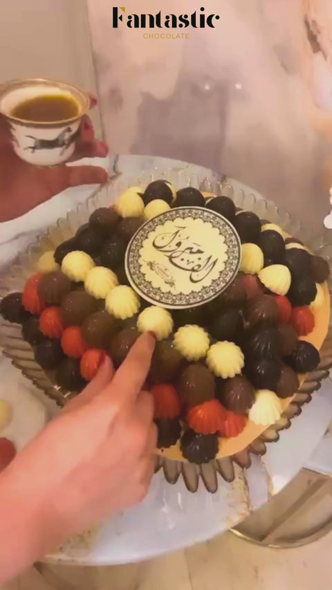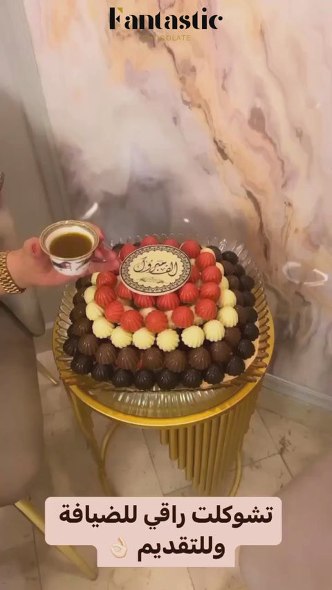 صينية كريستال من شوكولاته (باللون الاحمر، الابيض، البني، و الاسود) بنكهات مختلفة بحشوات من الكراميل المالح والفستق وحلوى غزل البنات والمستكة المقرمشة.