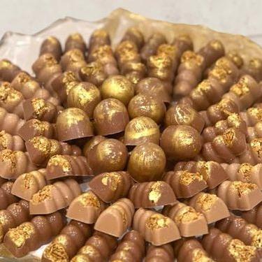 صينية كريستال من أصابع الشوكولاته الذهبية والبونبون الذهبي بحشوات من الكراميل المالح والفستق وحلوى غزل البنات والمستك...