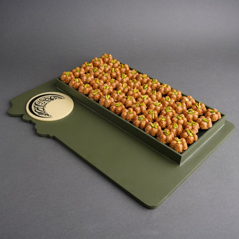 سمسمية تقليدية محضرة بالرهش والدبس الفاخر، مزينة بالفستق المقرمش ومشكلة على هيئة وردة أنيقة. القطع: 55 حبة