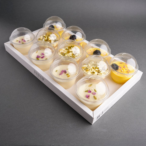 تشكيلة كاسات ترافل بنكهات متنوعة تشمل وكاسات مهلبية مزينة بالفستق والورد وكاسات كاسترد مع بلاك بيري وكاسات عصملية بالقشطة العربية